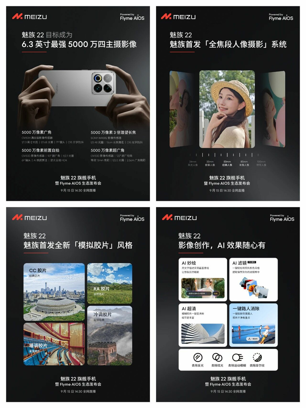 ,魅族科技官方今日宣布,魅族 22 旗舰手机暨 FlymeAIOS 生态发布会将于 9 月 15 日 14:30 在珠海・魅族科技大楼举行,届时将带来魅族 22 手机、AI 拍摄眼镜、Flyme Auto 2、PΛNDΛER 等新品。