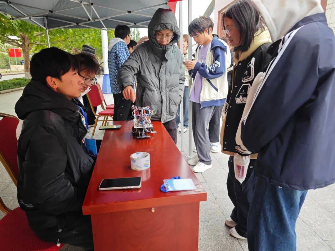 活动展区中央,三大社团的10余件作品排兵布阵。智控逐梦的足语音舞蹈机器人最为亮眼,它融合四足仿生、语音与动态舞蹈技术,高扭矩关节实现轻盈步态与细腻舞姿,可语音指令启停、切换曲风,随节奏闪LED灯,是适用于科普、演出、家用的“科技舞者”。寻迹避障小车也不容小觑,它集灰度传感寻迹、超声波避障与智能驱动技术,沿预设轨迹精准行驶,遇障碍实时启停绕行,是小巧实用的“智能巡航助手”。每个展台前,社团技术骨干都会进行3-5分钟讲解,将创意来源—技术原理—安全提示串联成完整故事。