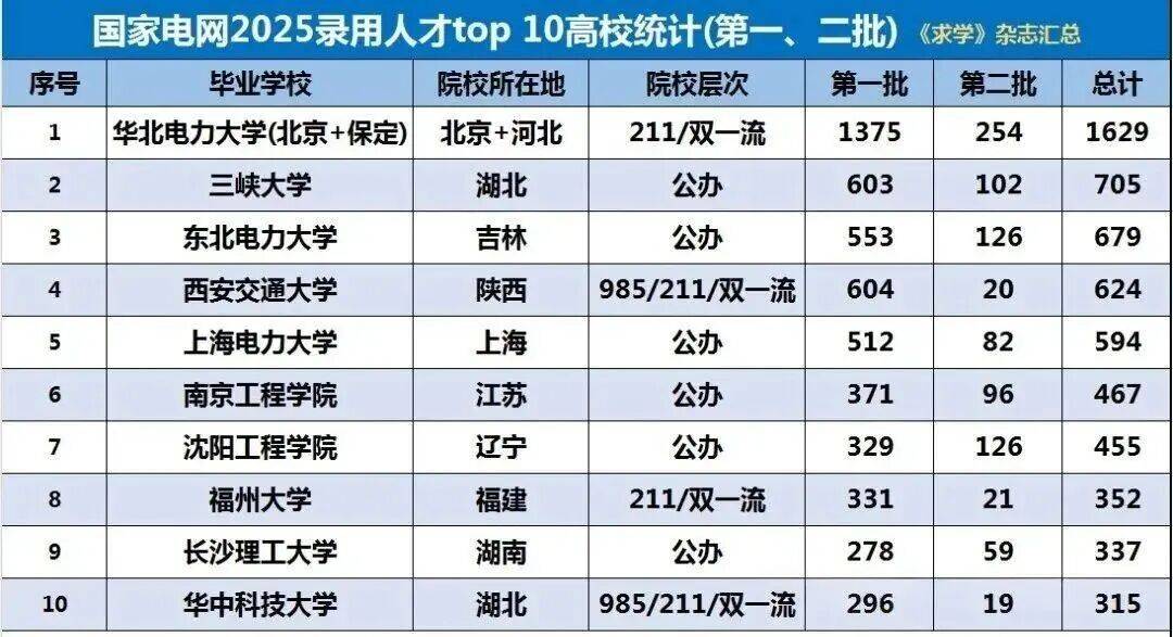 如上表所示:华北电力大学2025年国家电网两批次共录用1629人,断层领先。排名前5的高校中,录用人数均在500人以上,分别是:华北电力大学、三峡大学、东北电力大学、西安交通大学、上海电力大学。