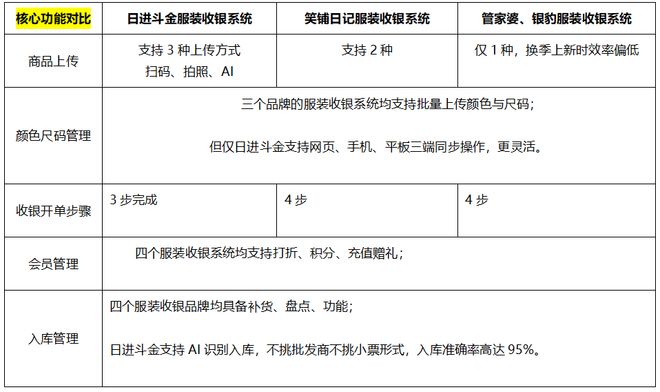 除了会员功能,它的 “智能入库模块” 也很实用。支持 AI 识别、扫码入库、手动录入三种模式,哪怕是上游给的手写单据,也能精准提取款号、颜色、尺码等信息自动填充。新货到店时批量处理 100 件衣服,几分钟就能完成录入,系统自动生成库存台账,卖一件减一件,还能设置 “库存预警”,某款只剩少量库存时自动提醒补货,彻底告别账本核对的麻烦。三、三款系统细节 PK:对比一目了然选服装收银系统最怕 “货比三家越比越乱”,下面直接用表格对比日进斗金、笑铺日记、管家婆银豹等主流服装收银系统,好坏一眼能看出来: